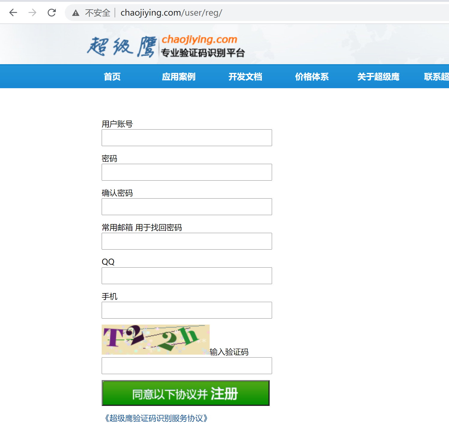 (1) 点击 在浏览器中打开打码平台网页,并且单击首页的 用户注册 按钮,如下图所示。