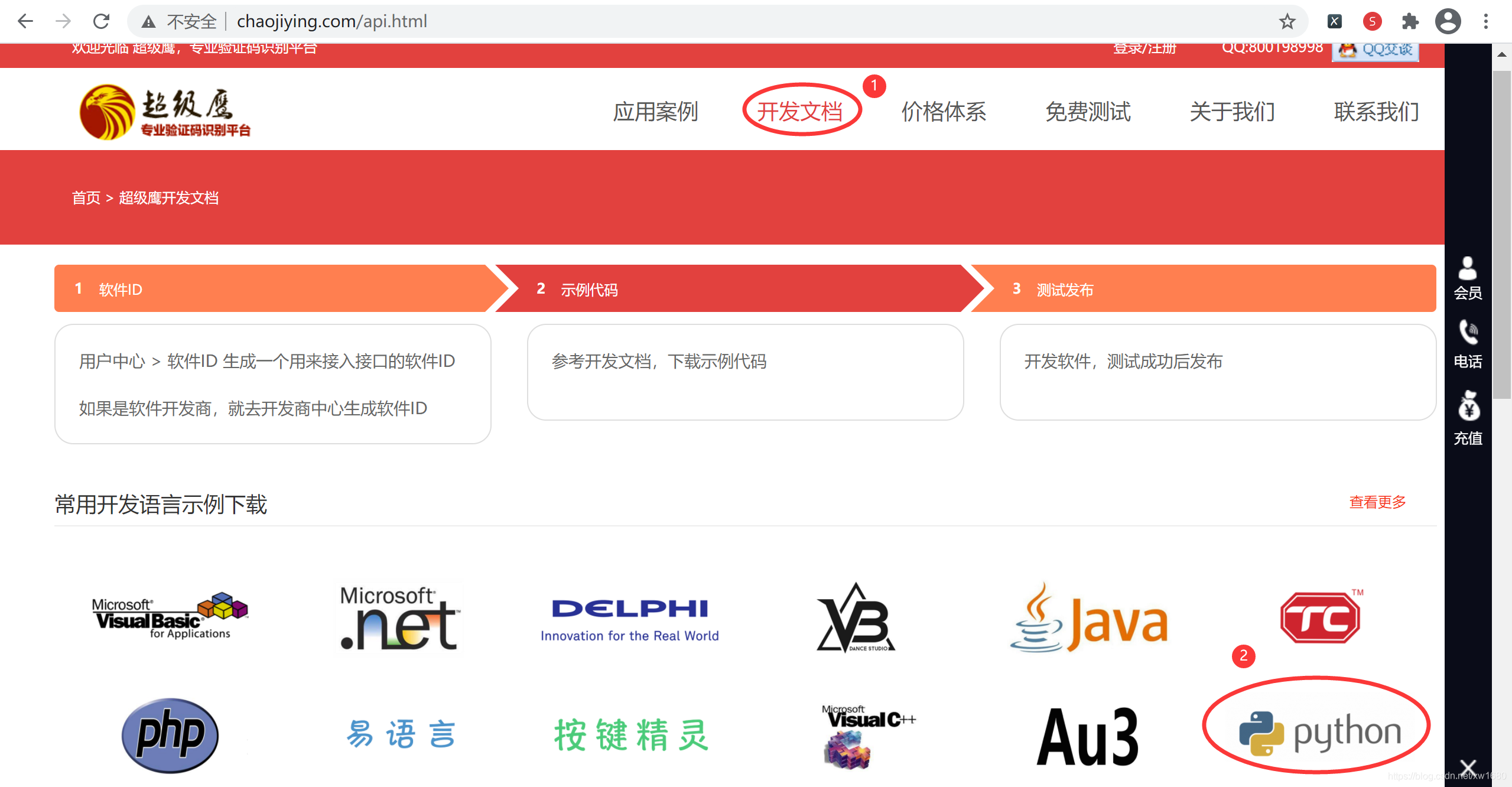 说明:账号注册完成以后可以联系平台的客服人员,申请免费测试的题分。   (3) 账号注册完成以后,在网页的顶部导航栏中选择 开发文档,然后在常用开发语言示例下载中选择 Python 语言,如下图所示。